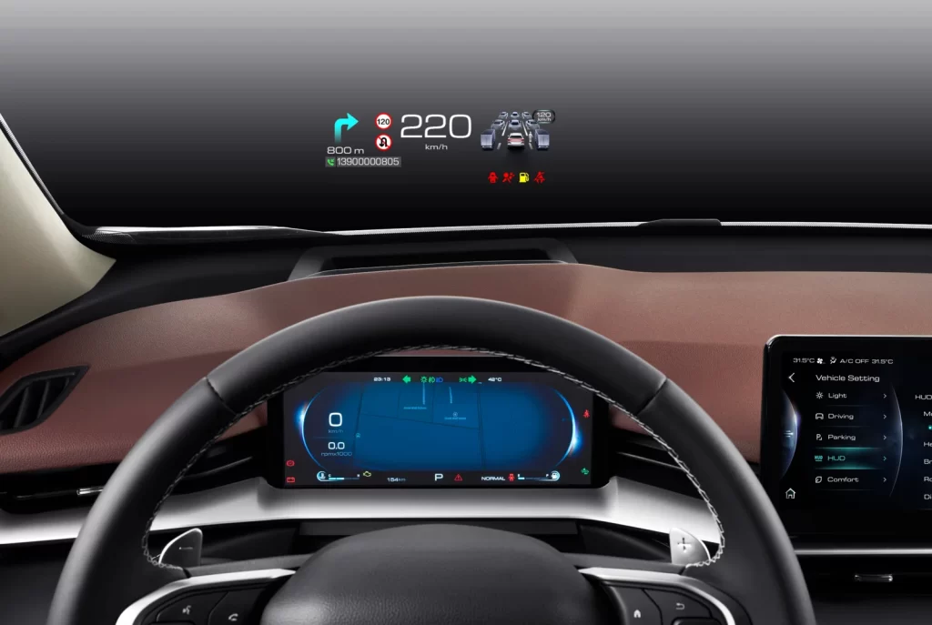 Además, cuenta con W-HUD (Head-Up Display), se trata de un sistema que proyecta información básica sobre el parabrisas, siempre en la línea de visión del conductor. La misión principal de este sistema es que el conductor no aparte la visión de la carretera.a.
